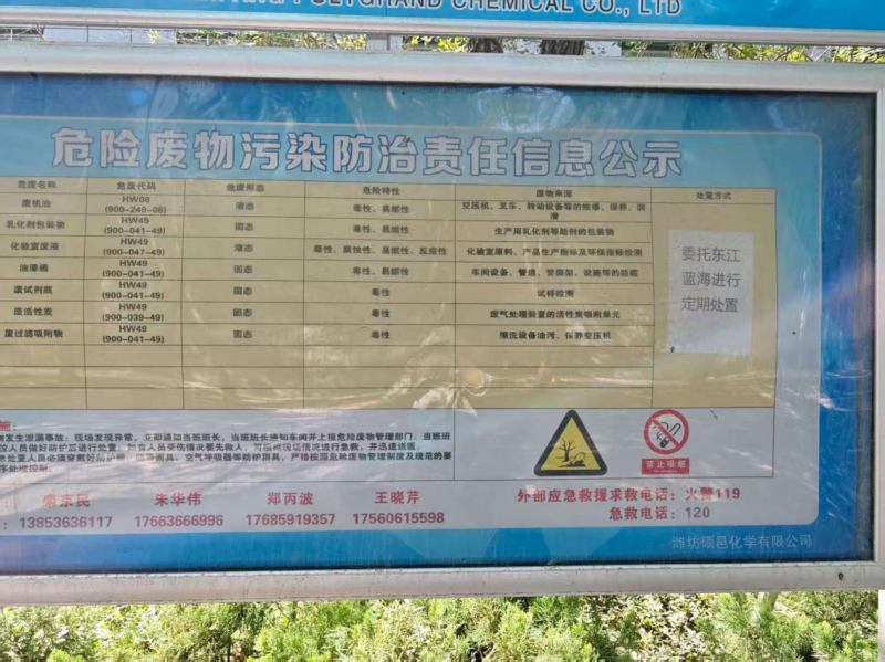 我濰坊碩邑化學(xué)有限公司現(xiàn)有危險(xiǎn)廢物八種,分別為廢活性炭(HW49 900-039-49)、乳化劑等助劑包裝物(HW49 900-041-49)、油漆桶(HW49 900-041-49)、廢試劑瓶(HW49 900-041-49)、化驗(yàn)室廢液(HW49 900-047-49)、廢機(jī)油桶(HW08 900-249-08)、廢機(jī)油(HW08 900-214-08)、廢過(guò)濾吸附物(HW49 900-041-49)。